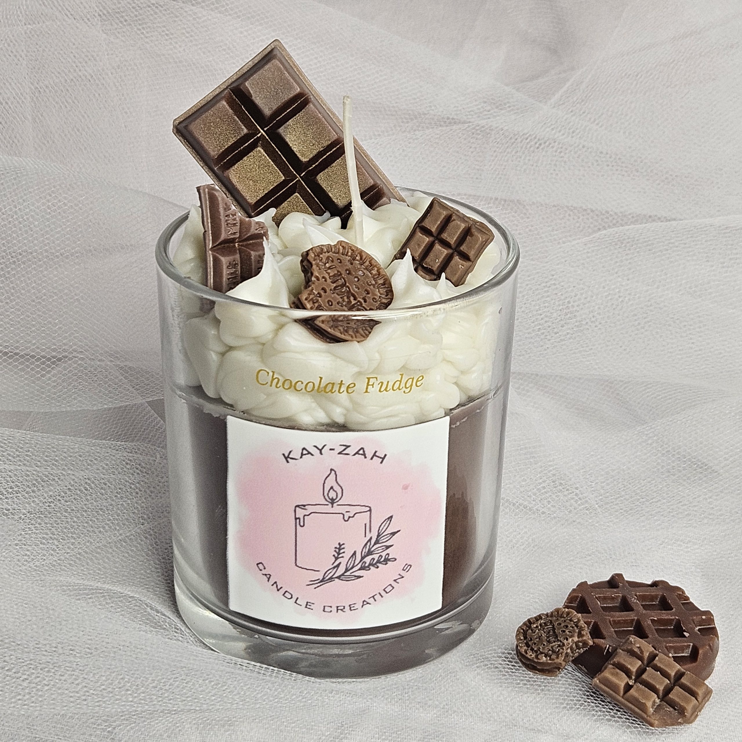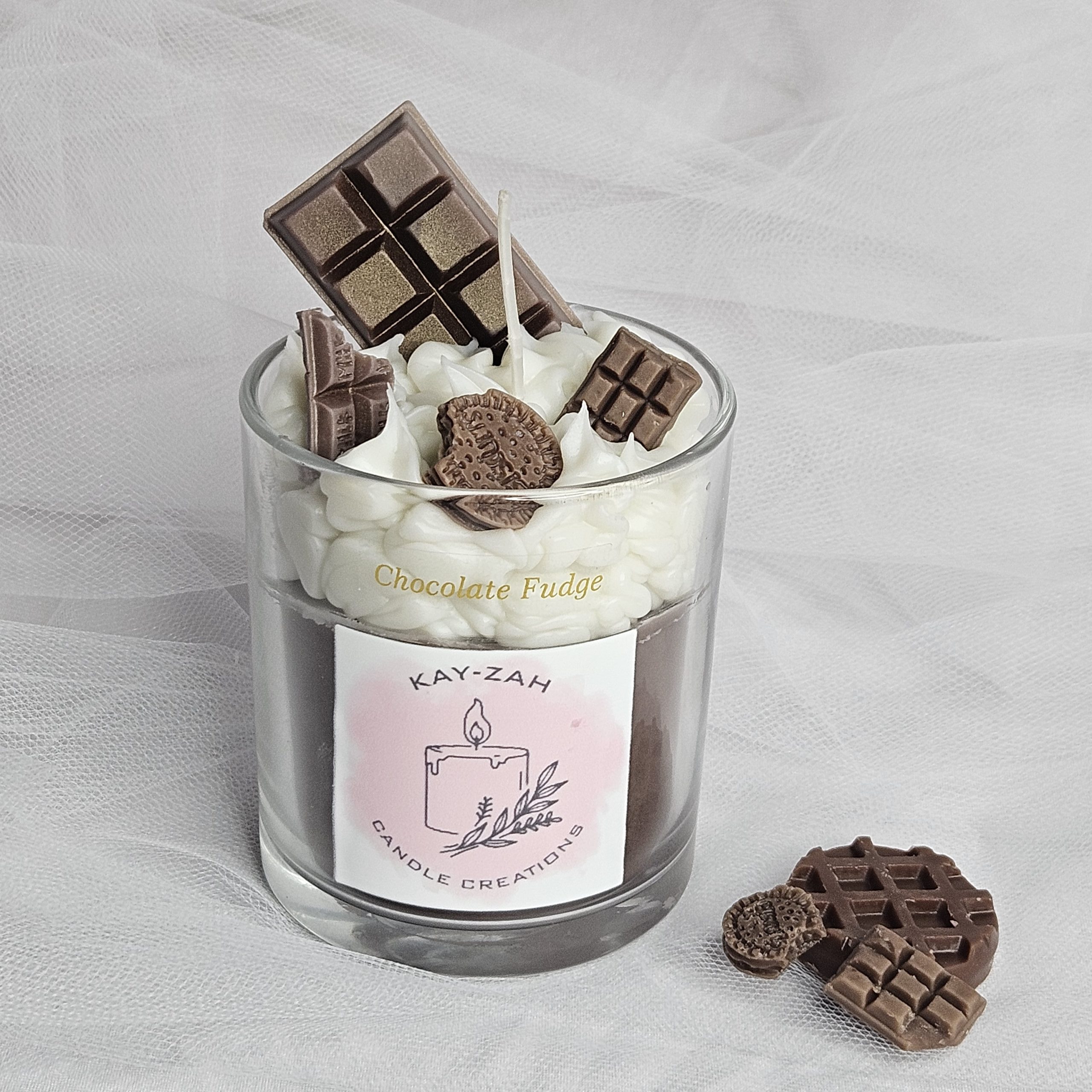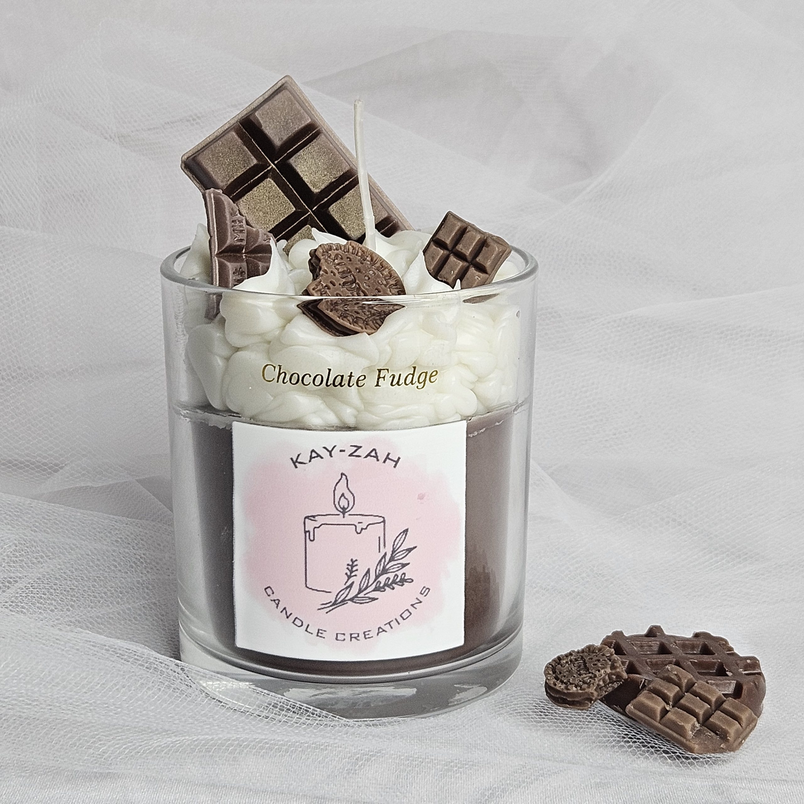 Our Chocolate Fudge soy wax blend typically evokes the rich, decadent aroma of freshly made fudge with hints of vanilla.  With a mix of Chocolate and Hazelnut scent topped with chocolate and cookie wax melts. Complimentary to a cozy night indoors.  A perfect gift for any occasion.