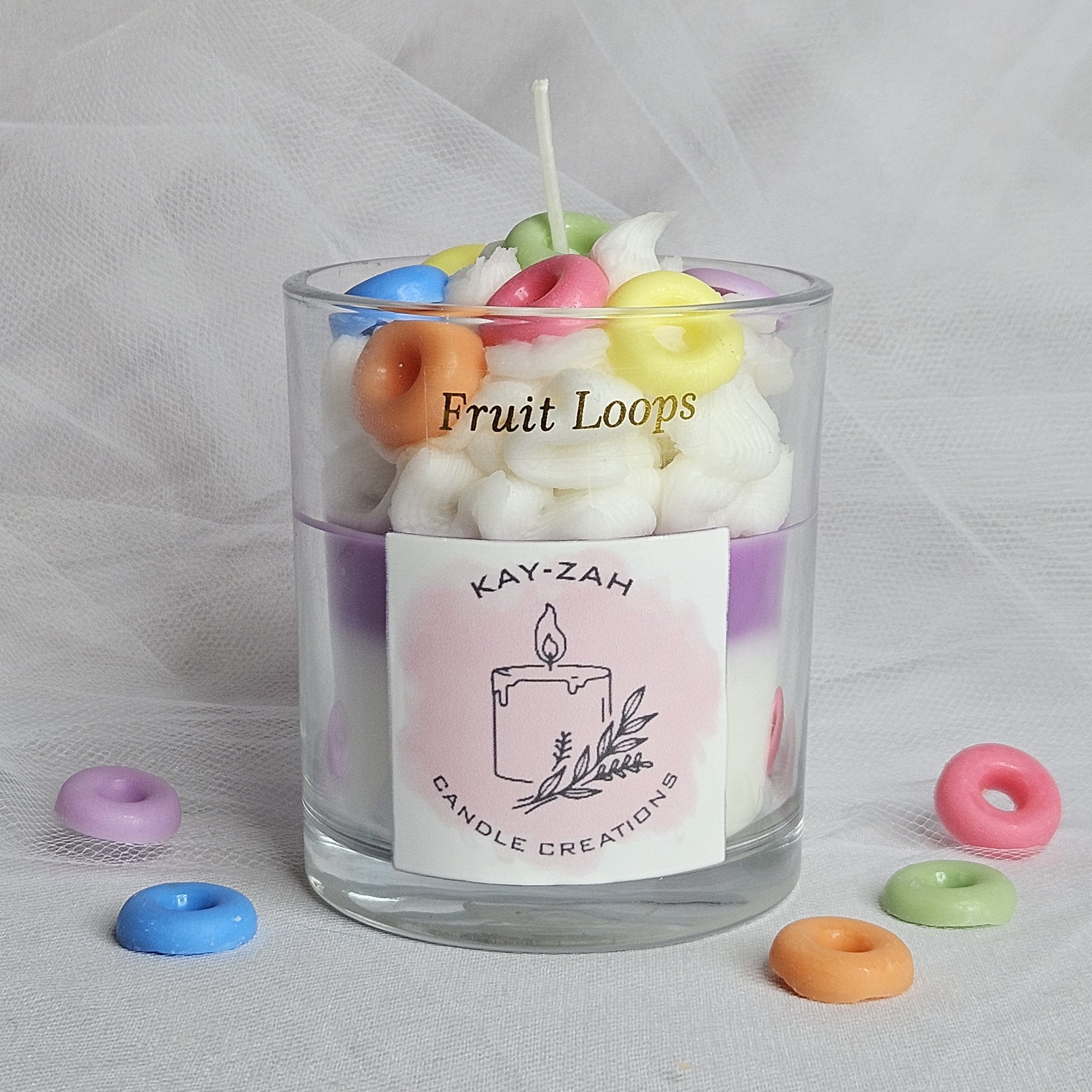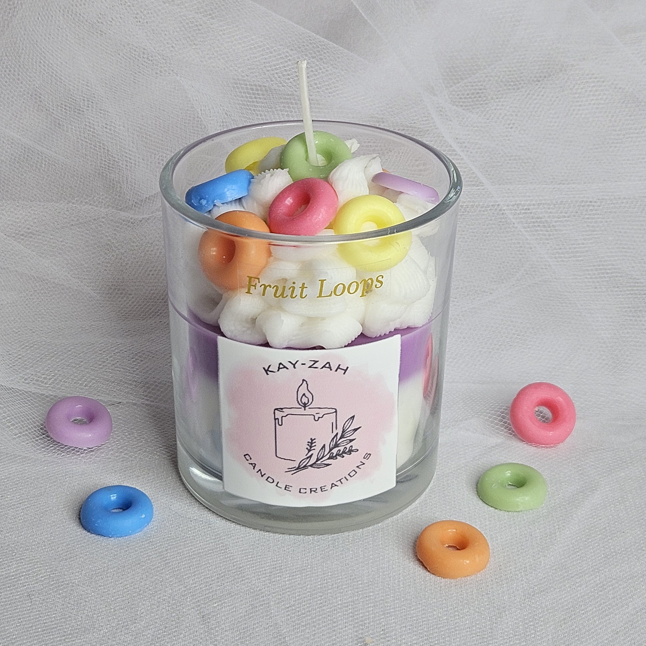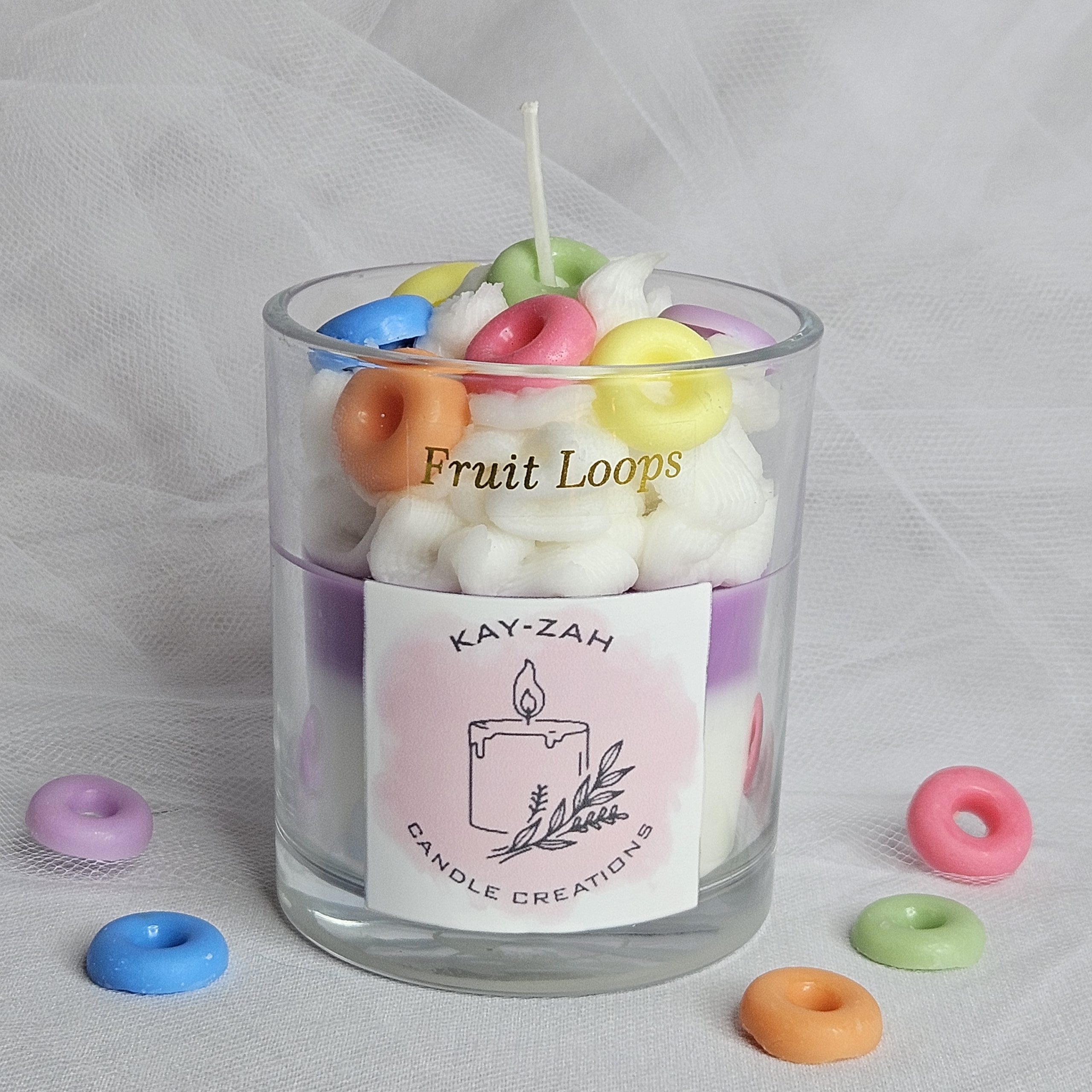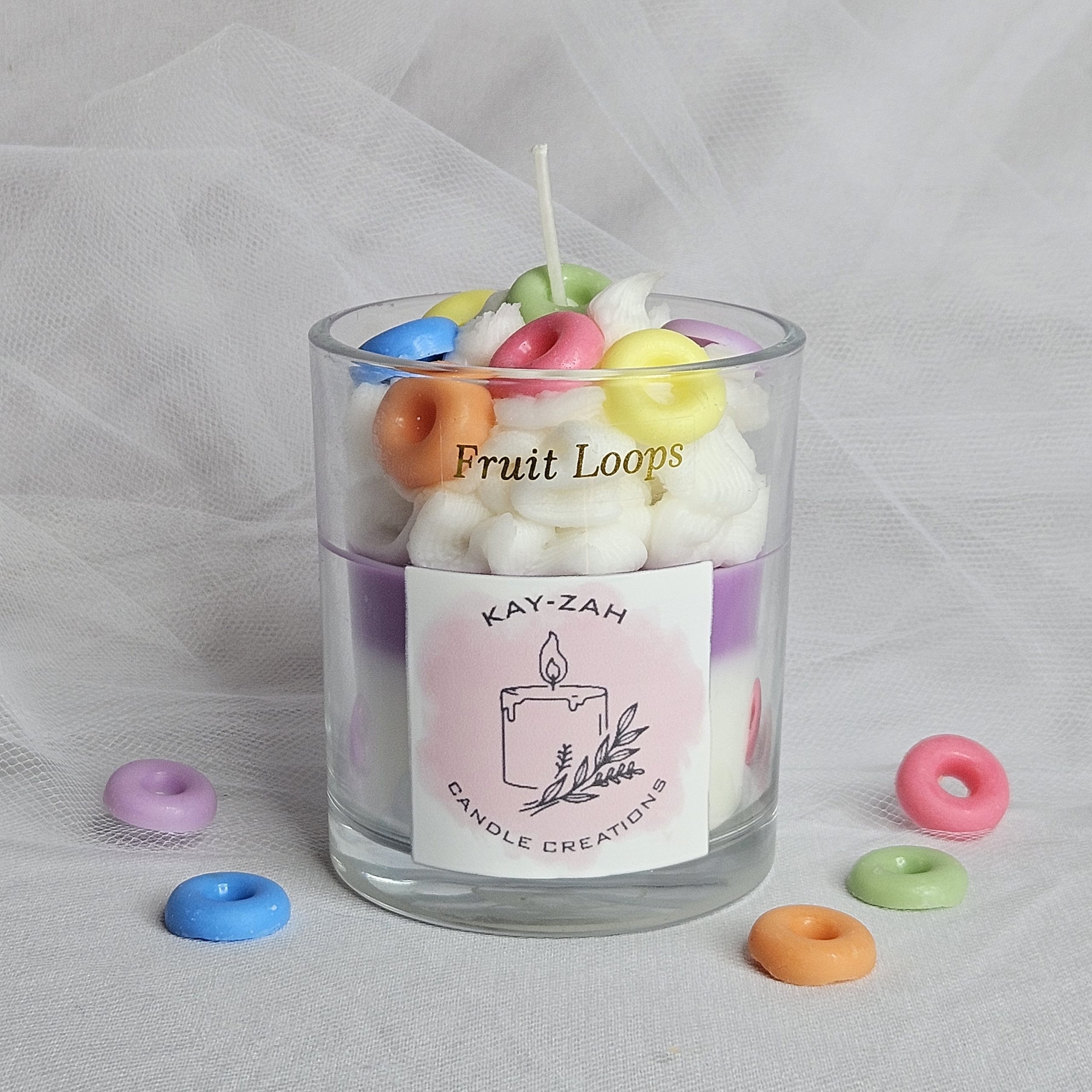 Our Fruit Loops scented soy wax blend, topped with colourful fruit loops aims to recreate the sweet, sugary and fruity aroma of the popular breaky cereal Fruit Loops. This bright and zesty candle throws a lovely feeling of warmth, remembering lasting childhood memories.