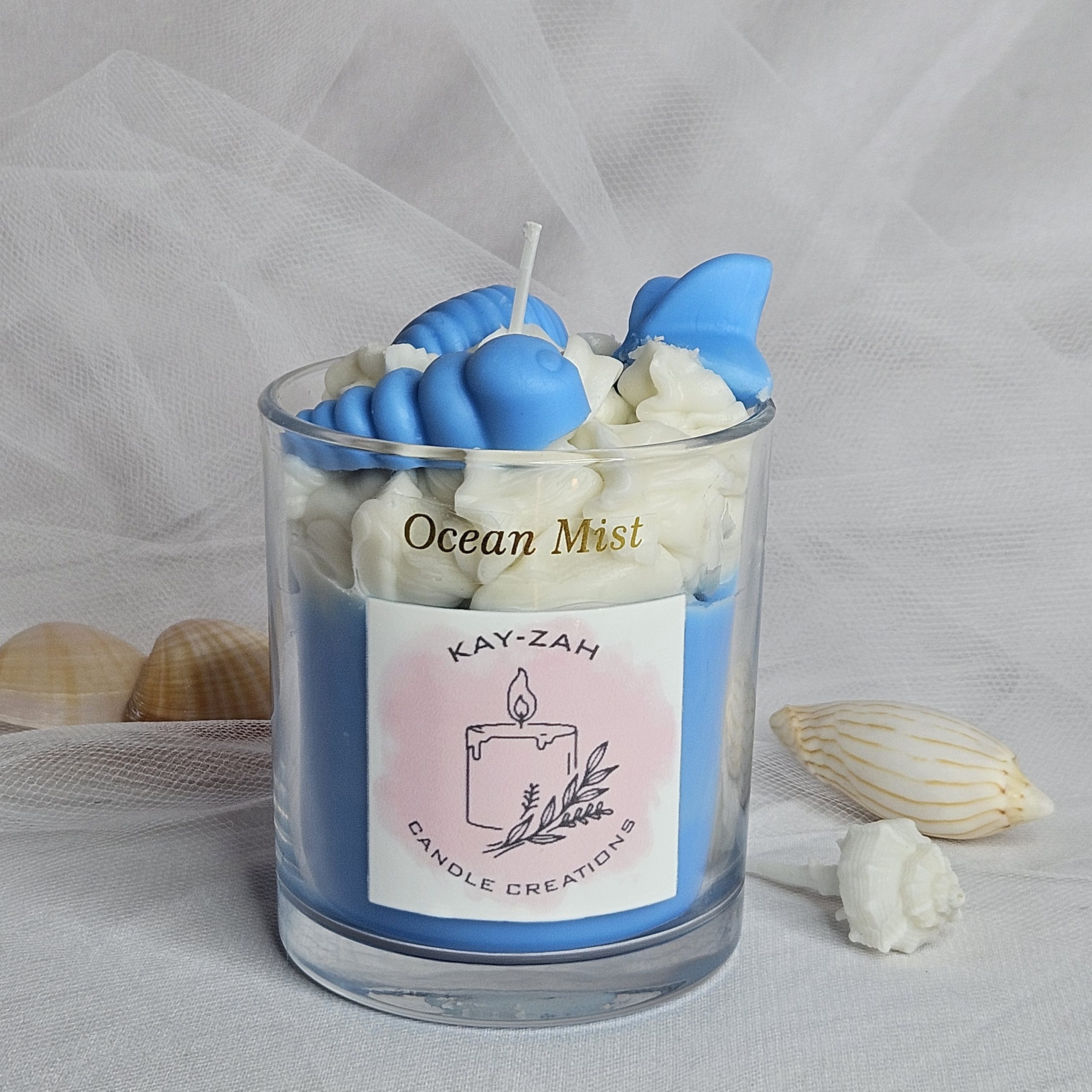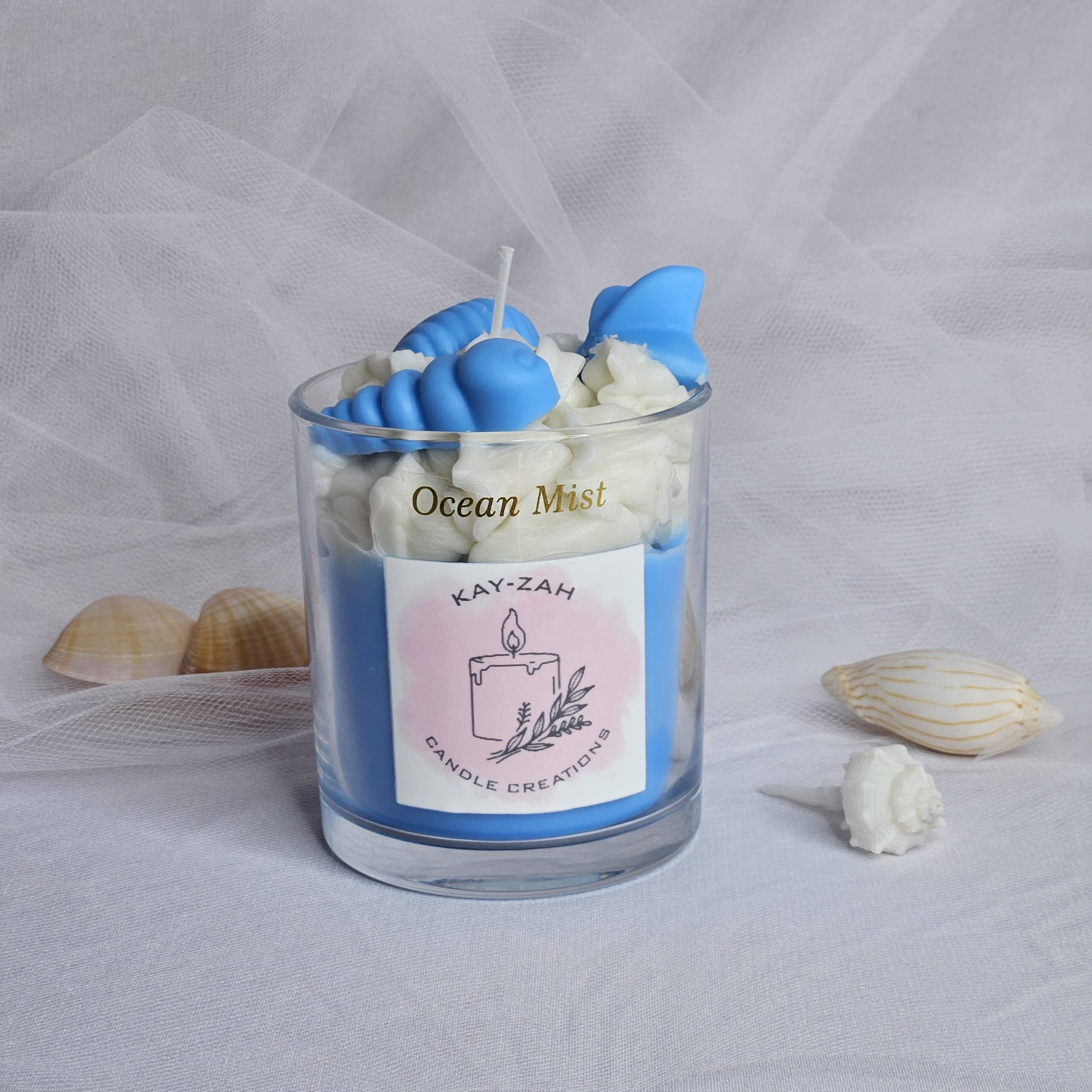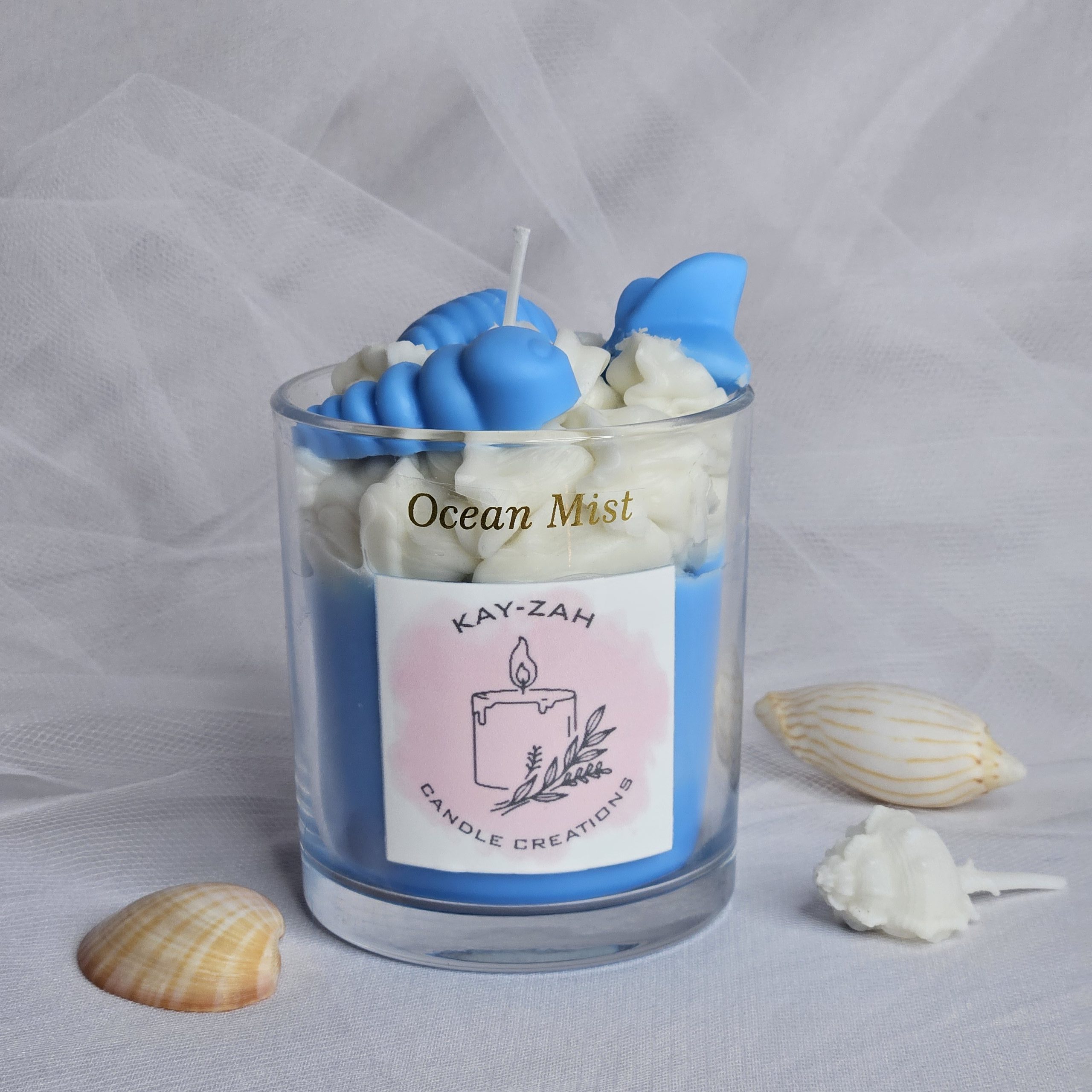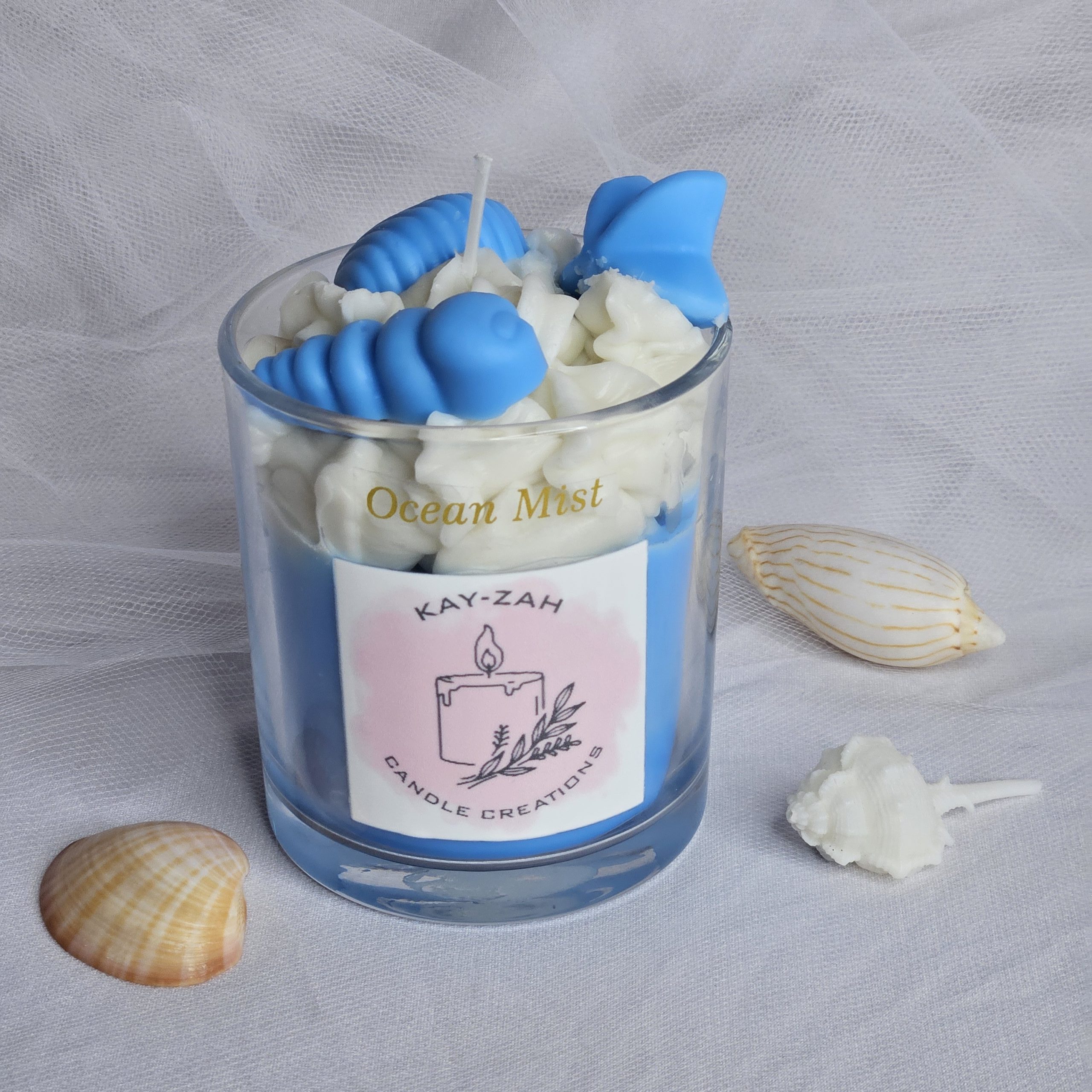 Our Sea Breeze soy wax blend candle with Aqua Flora scent topped with sea shell wax melts. Giving a calm, peaceful effect which evokes the relaxation of the sea or a fresh, invigorating breeze. With a hint of floral undertone for a more complex fragrance.